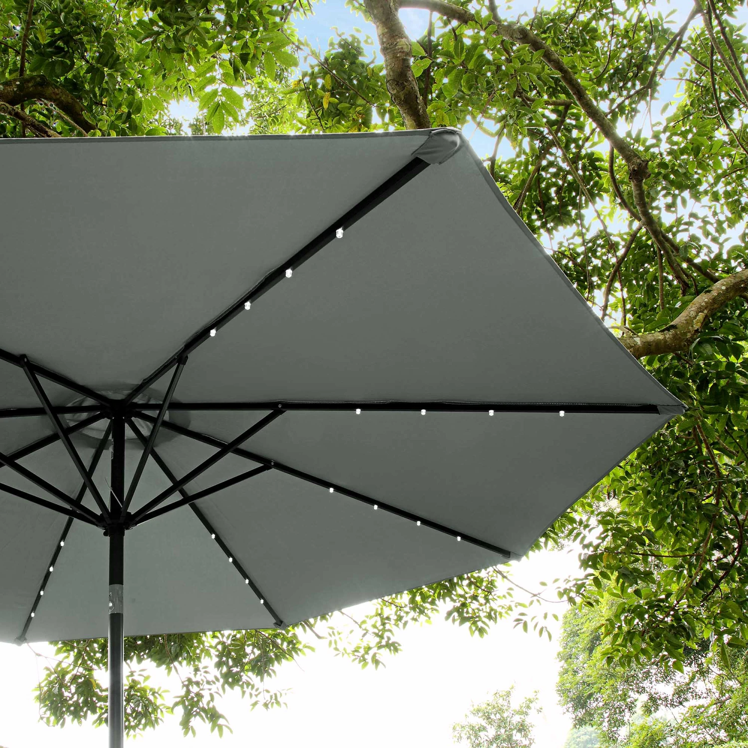 - Our large 3m parasol comes with 24 pre-installed energy-saving LED lights alongside the canopy ribs powered by solar energy collected by the attached panel.