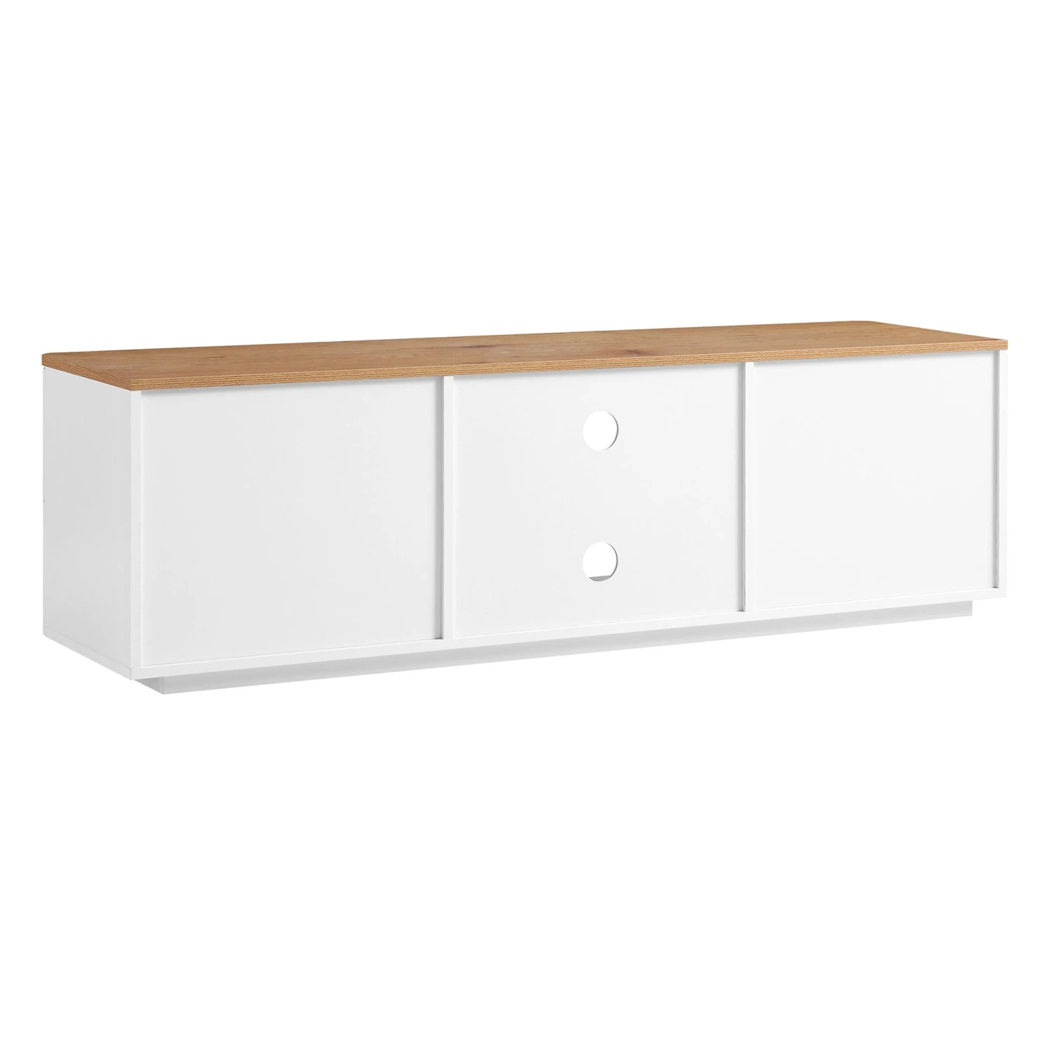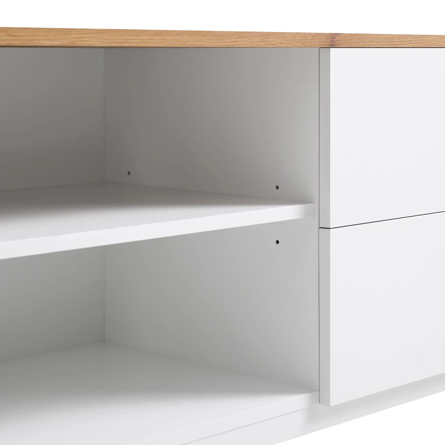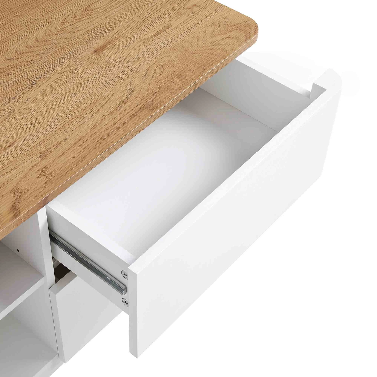 - The TV unit features curved corners, coordinated with matte white frame and oak effect top. for a softened, cosy look.