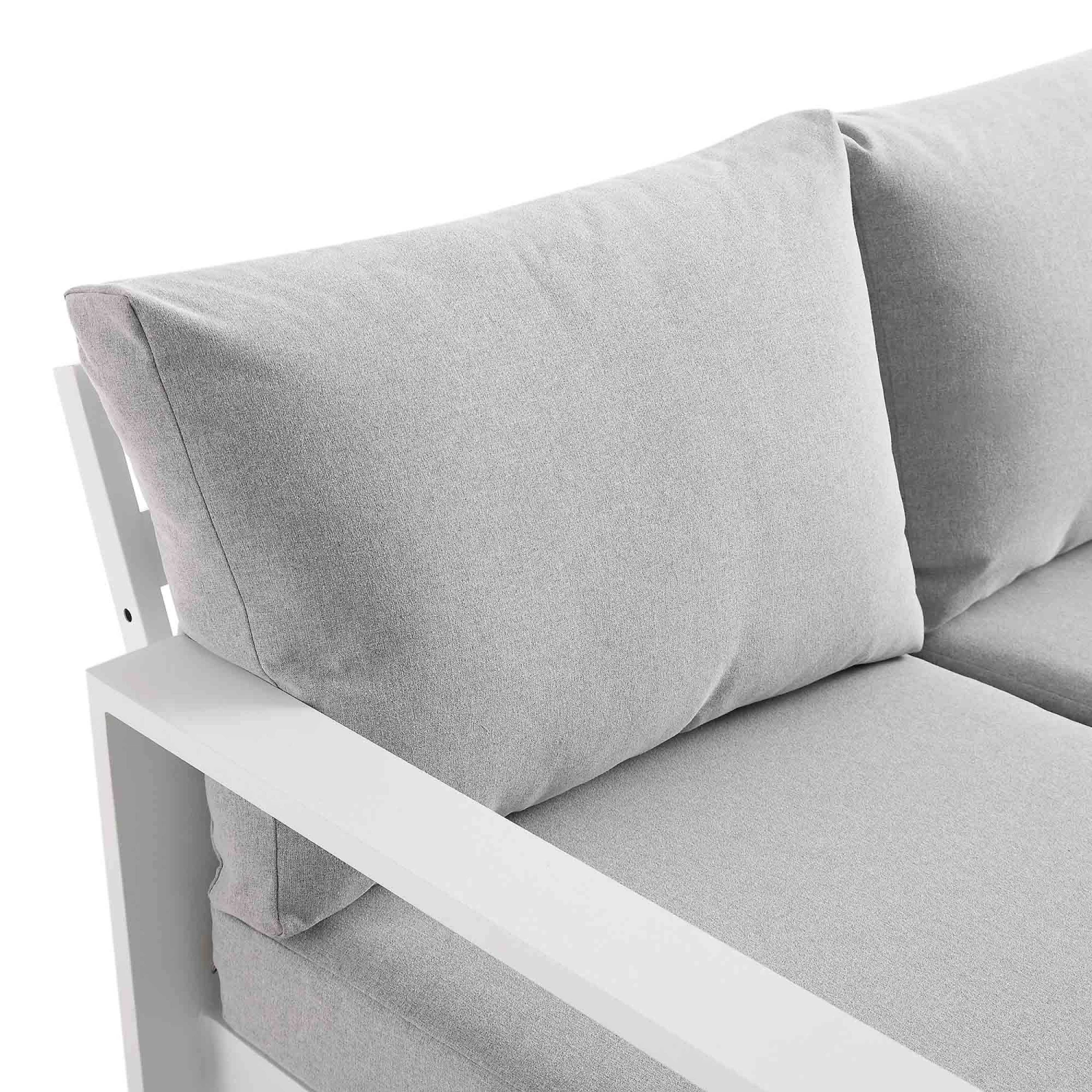 - Amply padded back and seat cushions are upholstered with UV resistant fabric in an elegant grey colour to coordinate the white frame.