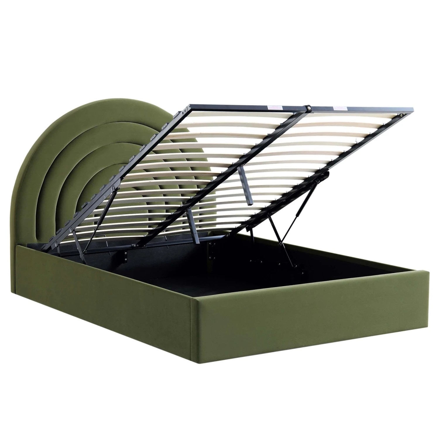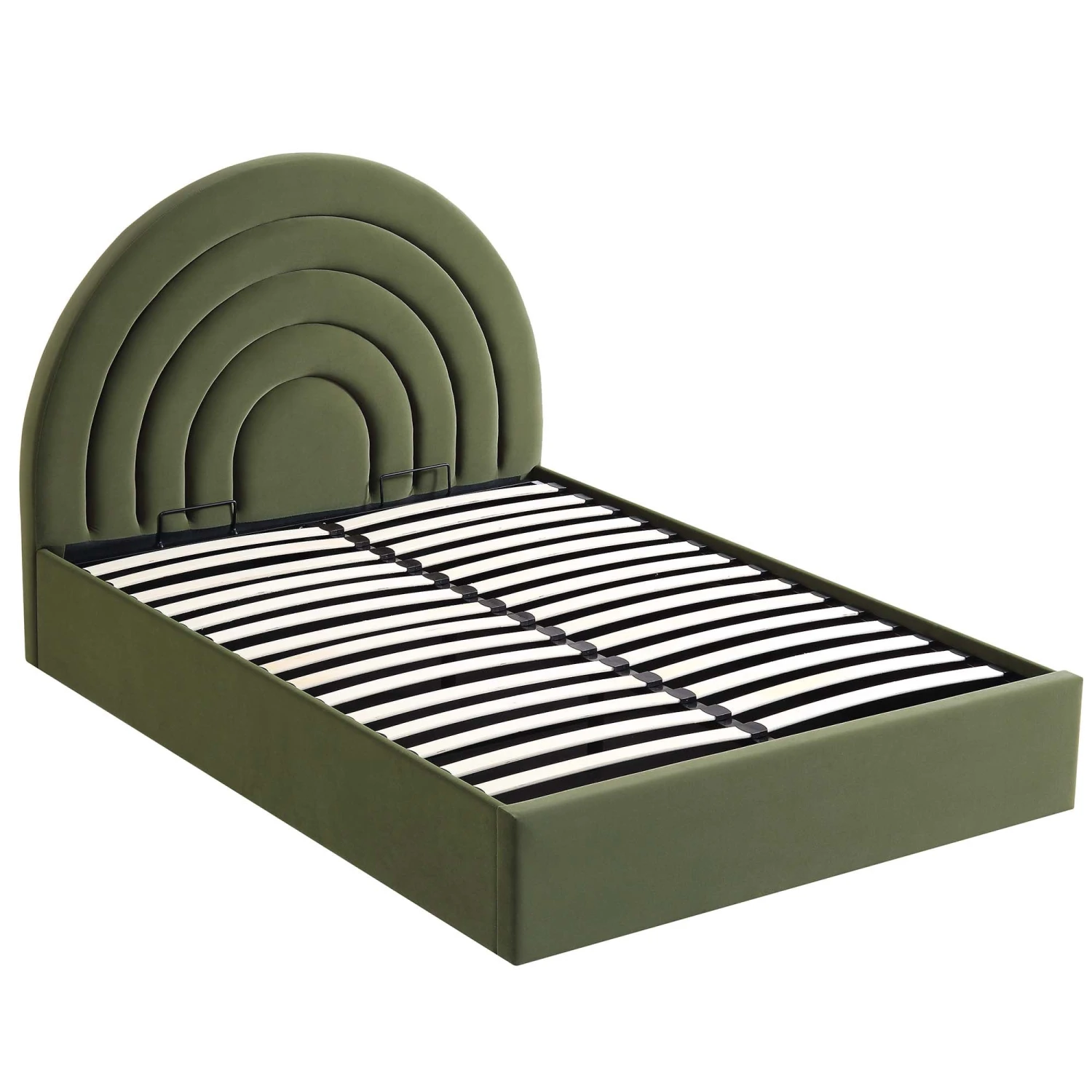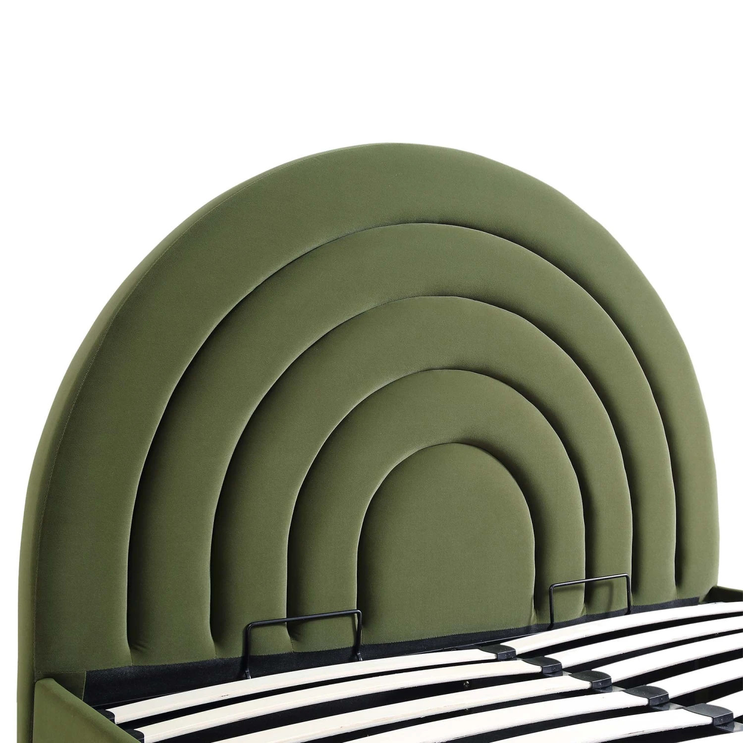 - The Archer bed features eye-popping arched rainbow shape fluted headboard design and functional under-bed storage.