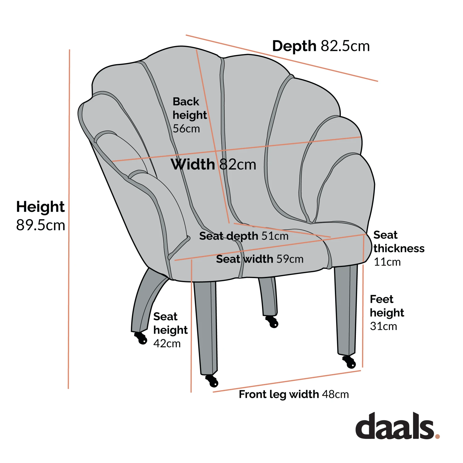 - The chair features a beautiful clam shell design enhanced with contrasting piping details.