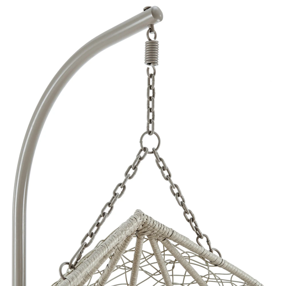- The hanging chair includes sumptuously filled cushion upholstered in beige colour weatherproof UV resistant fabric.