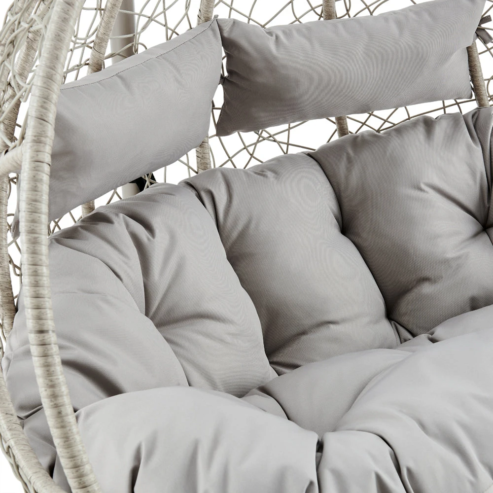 - Our Deneb hanging chair is made with durable hand woven light grey faux rattan, matched with comfortable grey cushions.