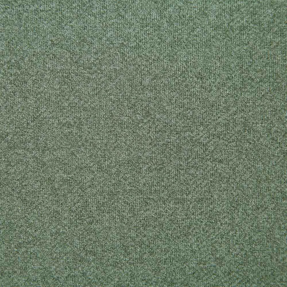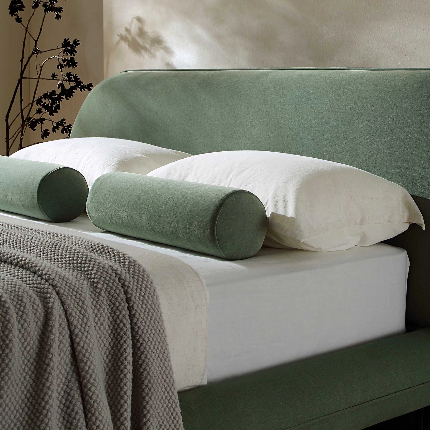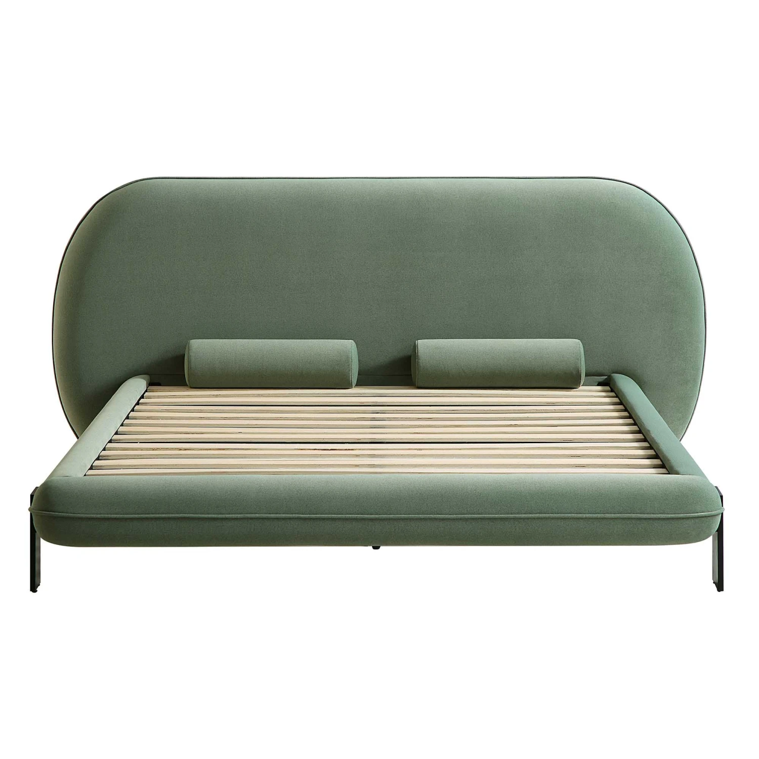 - The bed is beautifully upholstered in olive green fabric, accented with handcrafted piping details along the perimeter.