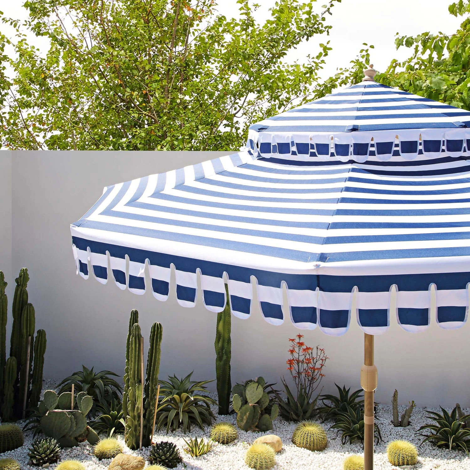 - With an enhanced 3 metre double-top design, our garden parasol has a blue and white striped design