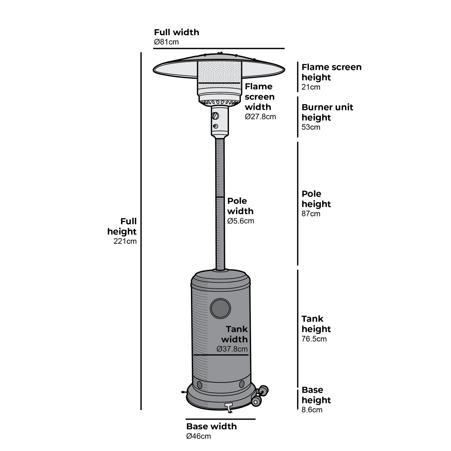 - Pilot Light included (the patio heater have a small gas flame which is kept alight in order to serve as an ignition source for a more powerful gas burner)