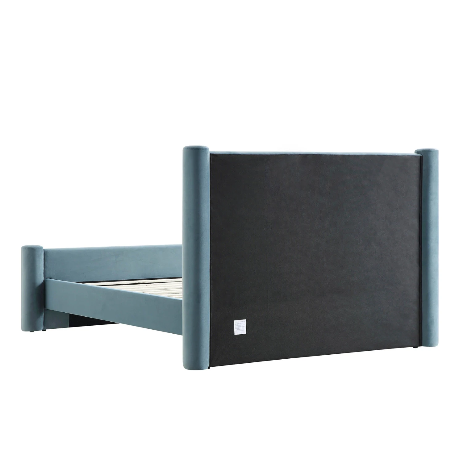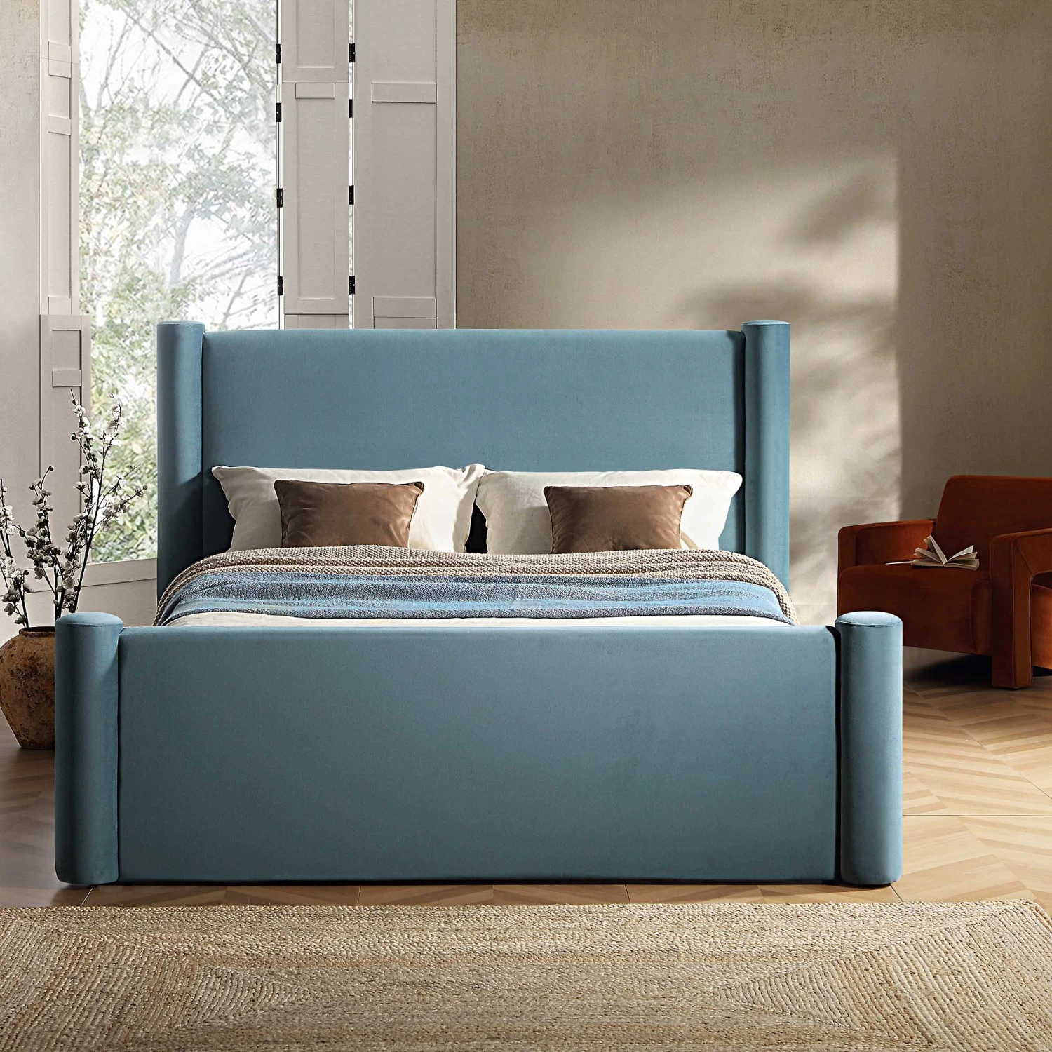 - Complete the look: Pictured with our Galerie Misty Blue Velvet Pillar Upholstered Bed is our stylish Brompton Sculptural Armchair in Rust Velvet