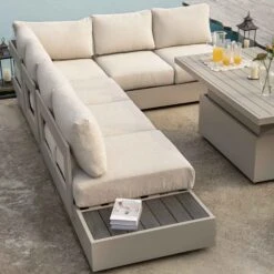 Jardin Aluminium Large Corner Casual Dining Set With Rising Firepit Table, Pumice