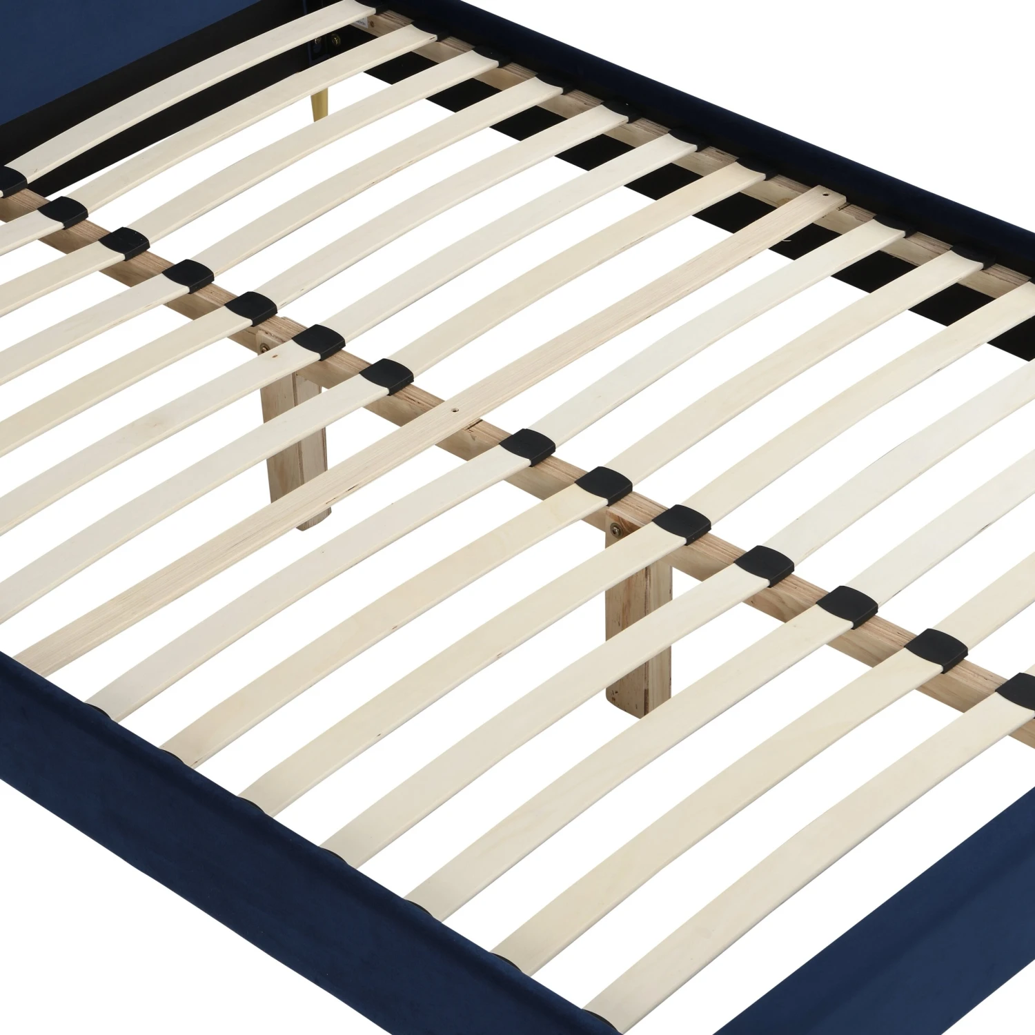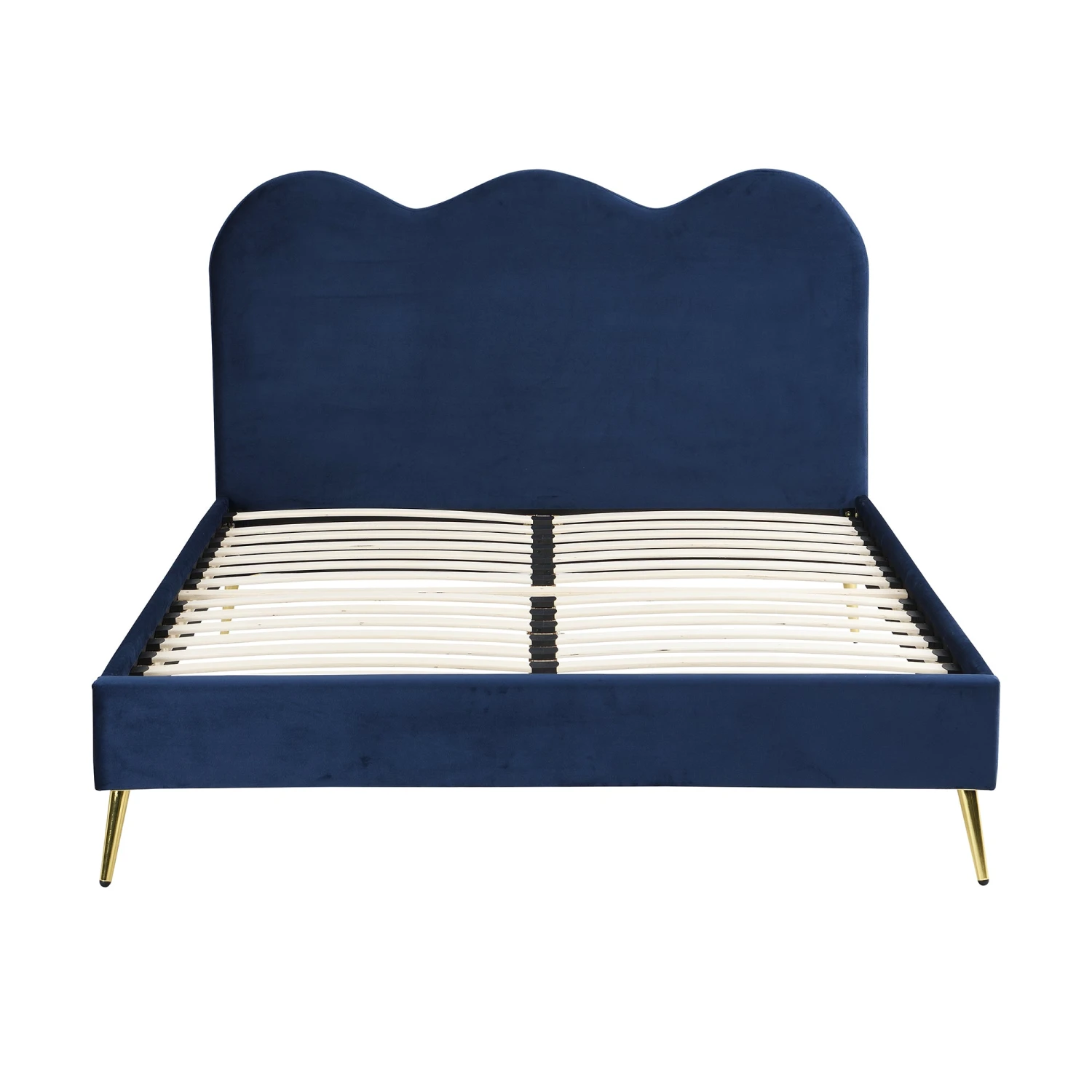 - Upholstered with plush velvet look fabric, the bed is accented with slender golden colour metal legs for a cosy and luxe look.