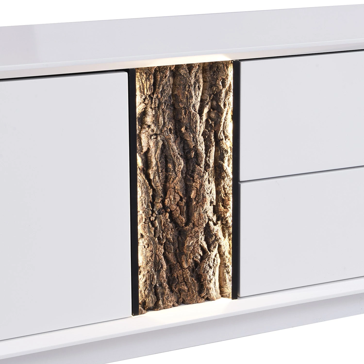 With a matte white PU finish, the Glen Tree Bark TV Unit is simple in its design. Consisting of two closed door cupboards and two drawers, the unit has plenty of storage space for your CDs, DVDs, gadgets and accessories.