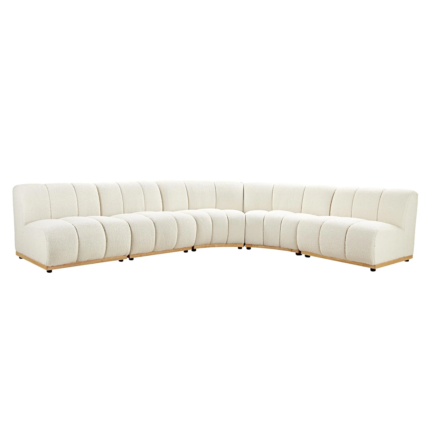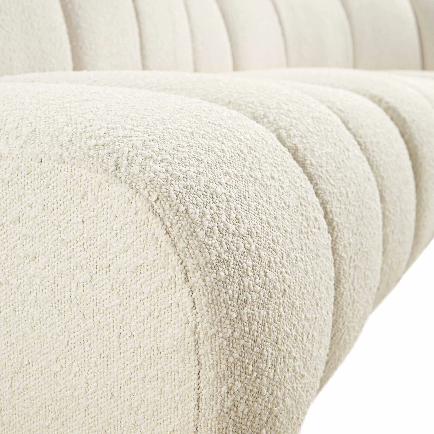 - Upholstered with beautiful ecru boucle fabric, the sofa modules are mounted on natural solid wood bases.
