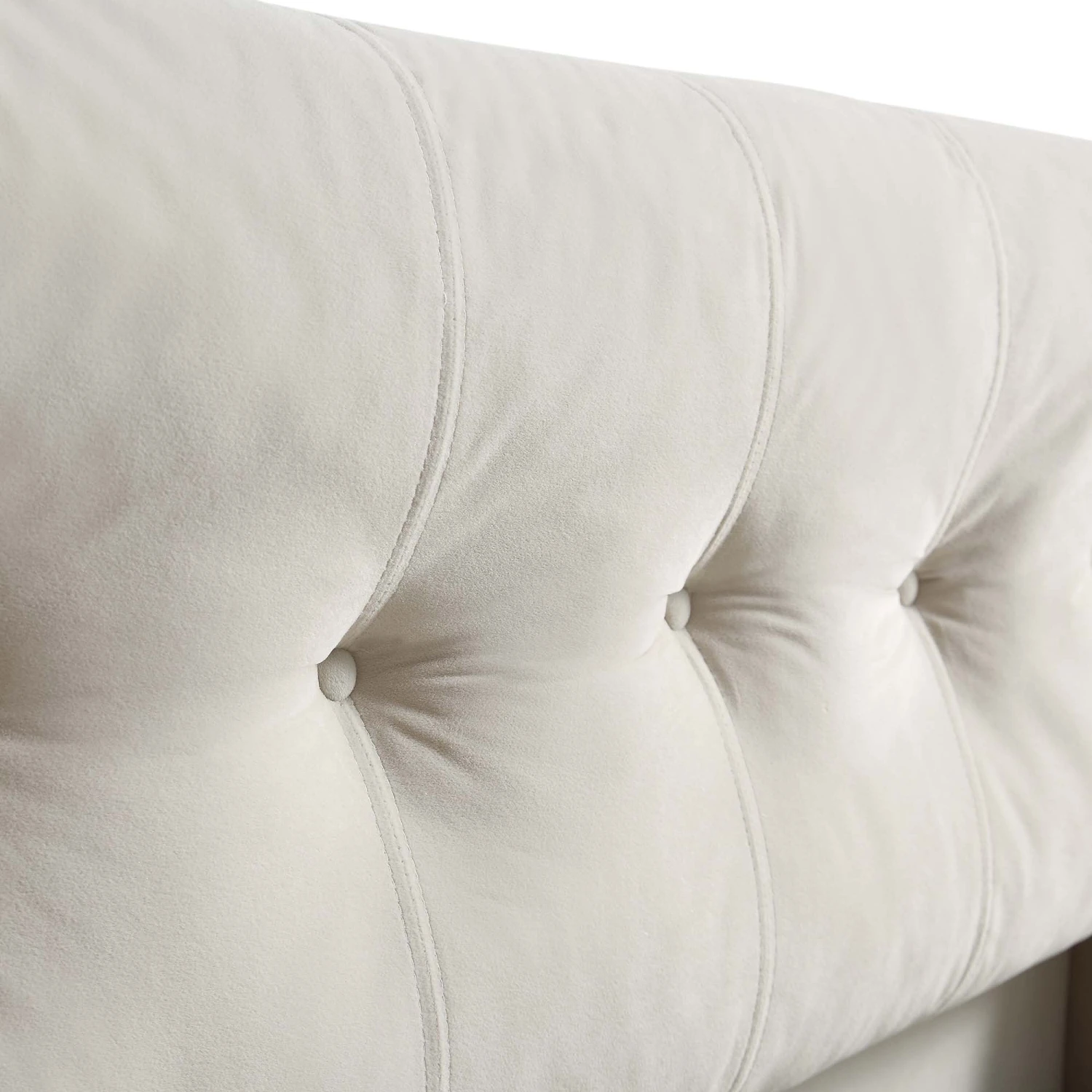 - Upholstered with soft velvet touch fabric in elegant champagne shade, the bed sits chrome corner feet for a modern glam look.