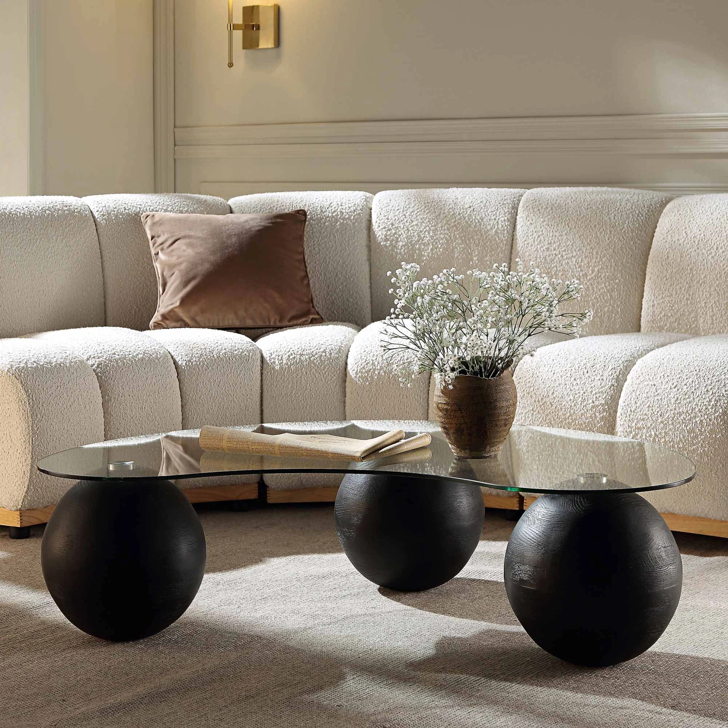 - Featuring three chunky round ball legs, the coffee table is perfect for making the space open and airy thanks to its curved kidney shaped clear glass top.