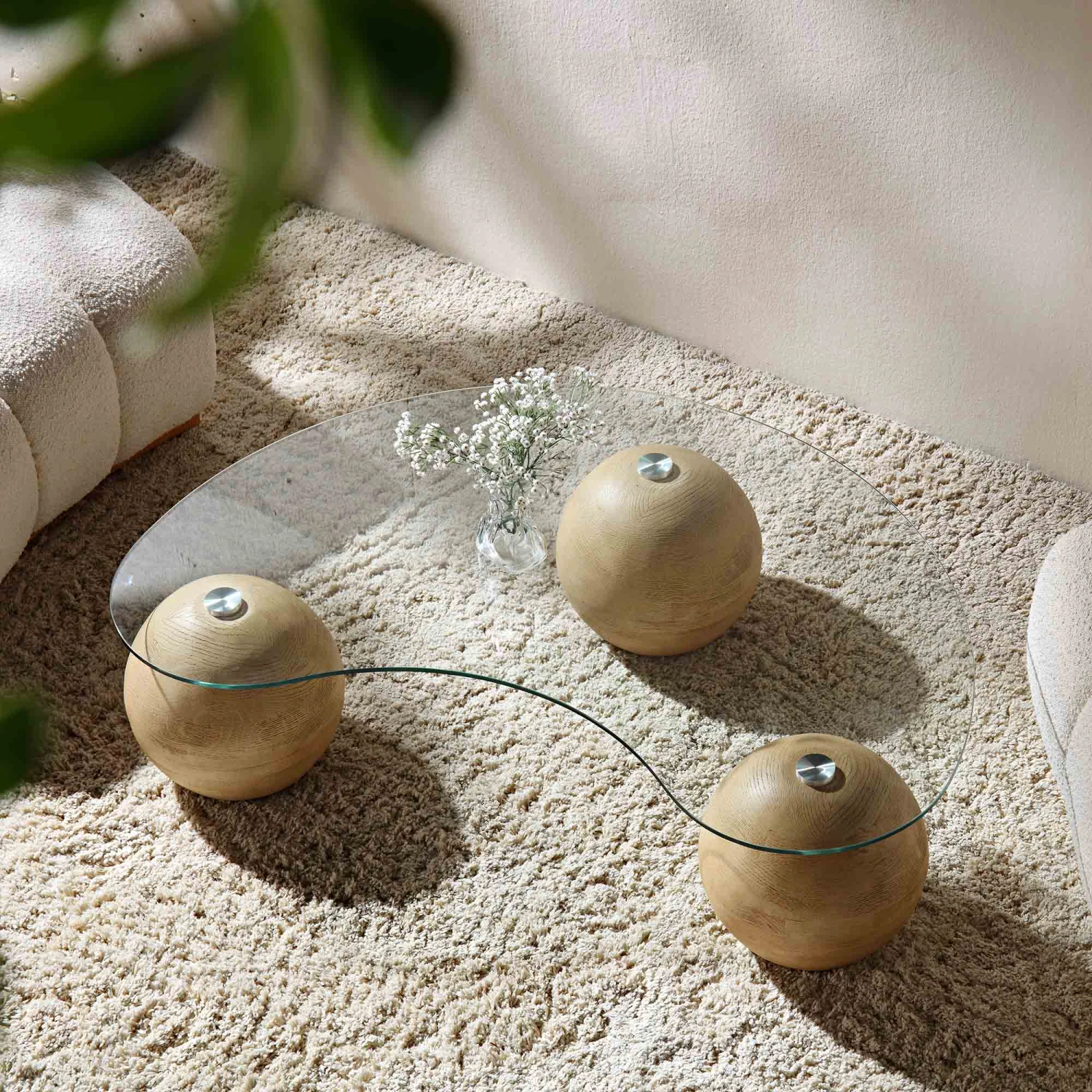 - Featuring three chunky round ball legs, the coffee table is perfect for making the space open and airy thanks to its curved kidney shaped clear glass top.