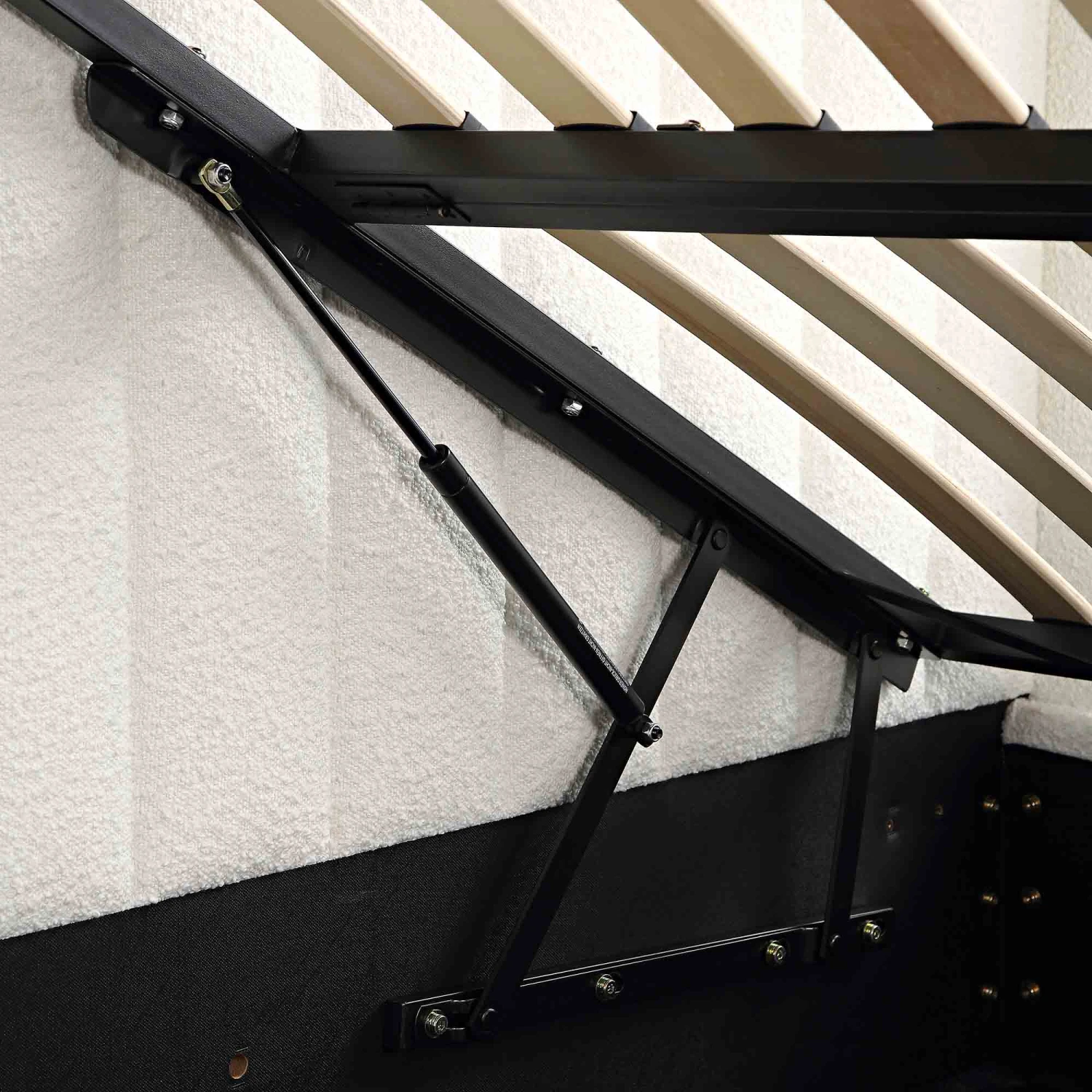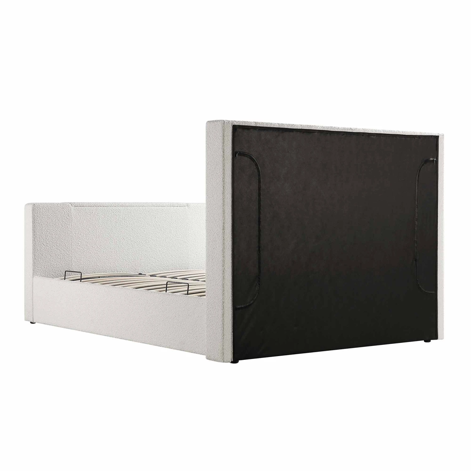 - The padded headboard with vertical tufting pairs perfectly with beautiful textured white boucle fabric for a modern chic look.